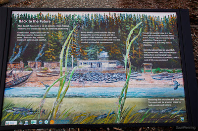New interpretive signs tell the story of the beach's history. This includes a fish hatchery built in the 1940's and a rip-rap sea wall installed to protect it. Unknown at the time, this kind of armoring disrupts natural beach processes and biological habitat. Driftwood, shore grasses, overhanging trees and normal upland runoff stabilize and nourish a healthy beach. Forage fish spawn there providing food for young salmon. Insects inhabiting the vegetation attract the forage fish as well as birds. Seawalls interfere with these processes rendering the shoreline and beach lifeless.